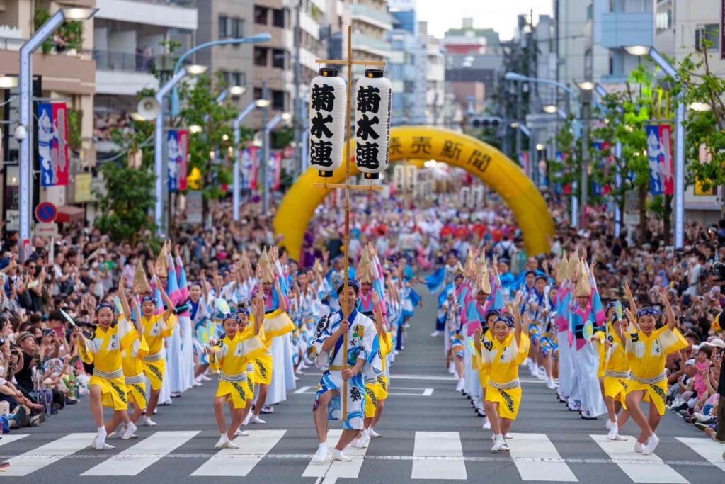 高円寺では最大人数の150名。元気で可愛らしい子供達、粋で華麗な女ハッピ、優雅で統制の取れた女踊り、巧みにうちわをさばく男踊りの4パートが皆様に踊りごころと笑顔をお伝えします。