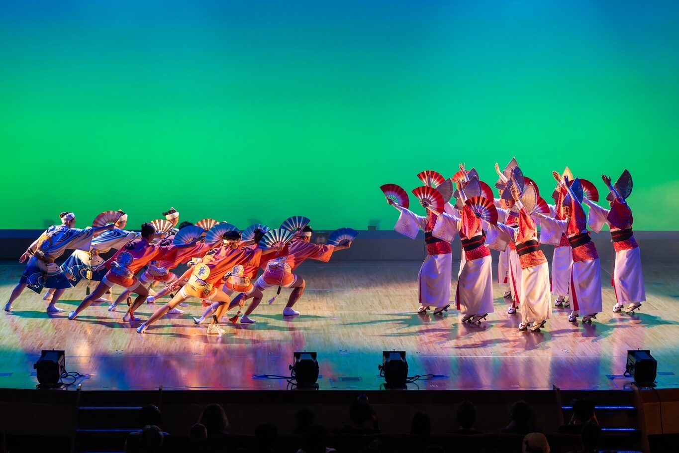 色鮮やかな衣装が舞台を彩り、軽快な二拍子に、力強い一拍子が重なる独自のリズムが響き渡ります。
